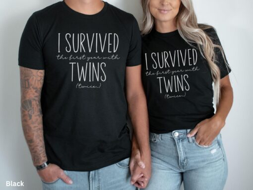 Funny Twin Mom Shirt I Survived First Year with Twins Matching Parent Tee for 2nd Twin Birthday Family Gift