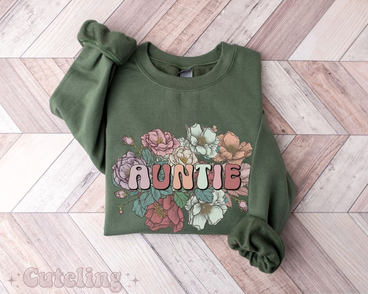 This cozy Auntie Sweatshirt is a delightful way to celebrate the special bond between an aunt and her family. Featuring a charming floral design it makes for an ideal pregnancy reveal gift for soon-to-be aunts. Whether its for Mothers Day or just because this cute mom t-shirt can express love and excitement. Perfect for casual outings or cozy days at home its a thoughtful addition to any aunts wardrobe. Give the gift of laughter with this funny mom shirt thats sure to bring smiles.
