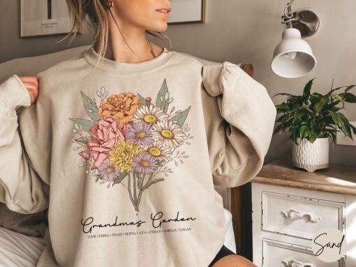 Custom Birth Month Flower Bouquet Sweatshirt Mothers Day Gift for Grandma Personalized Gifts for Mom Grandmas Garden Shirt With Names