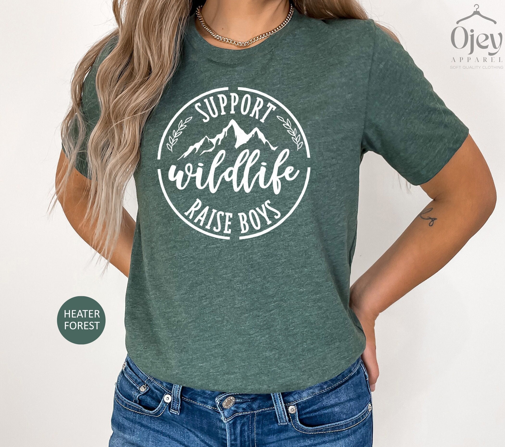 This Support Wildlife Raise Boys Shirt is a delightful addition to any moms wardrobe. Crafted for the vibrant mom life this cute mom t-shirt showcases your love for both wildlife and family. Perfect as a Mothers Day gift it blends humor with heart. Whether youre attending school events or enjoying family outings this shirt makes an ideal choice. Celebrate the best mom ever in style with this unique piece that captures the essence of motherhood—making it one of the top funny mom shirts around!