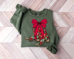 This unique Christmas Coquette Boots Sweatshirt combines festive cheer with western flair making it an ideal choice for holiday gatherings. Perfect for anyone looking for cute Christmas shirts or funny Christmas shirts It is a standout piece for family photo ops or cozy nights in. Great as a gift for cowgirls or those who love the spirit of the season this sweatshirt offers comfort and style during your Christmas vacation shirt needs.